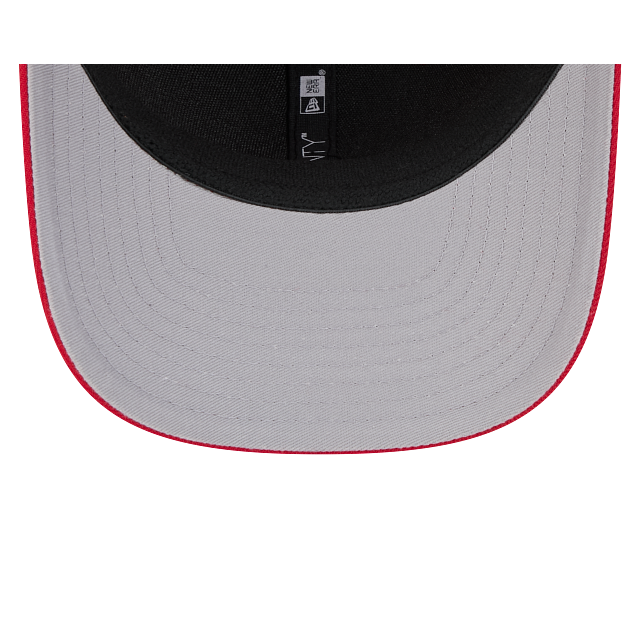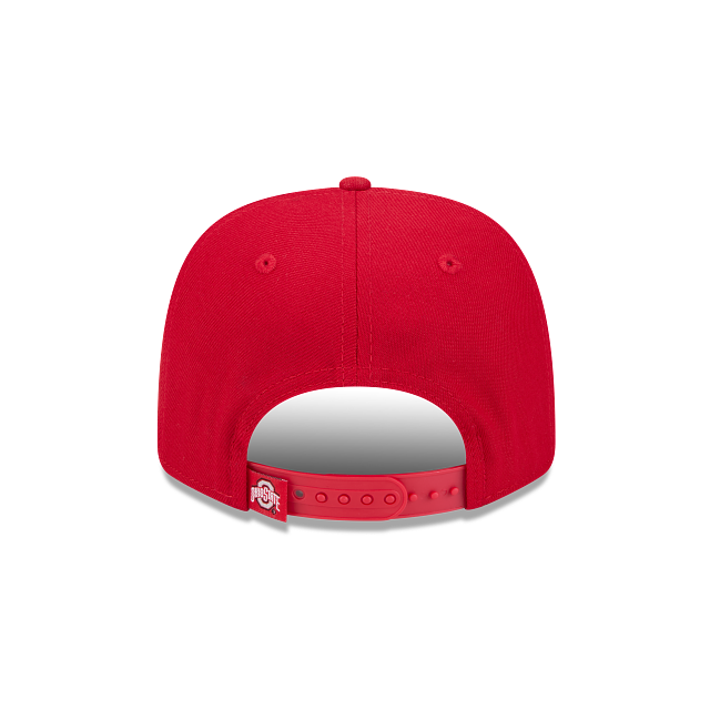 The striking red cap showcases a meticulously embroidered Ohio State logo across the front, complemented by the iconic New Era branding on the side.